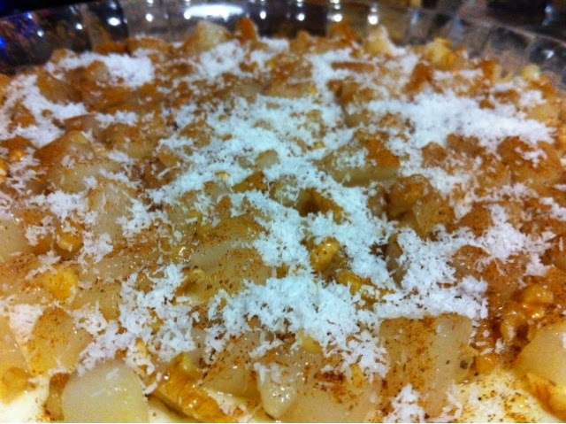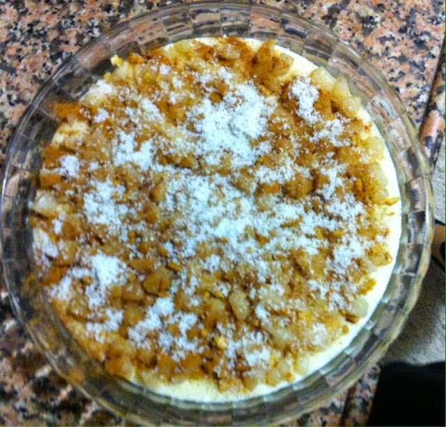 Üzeri için armutları soyup küp küp doğrayın ve tavaya alın. İçine şekeri ekleyin ve pişirin. Armutlar tamamen pişince soğuyan muhallebinin üzerine yayın. Tarçın, ceviz ve hindistan cevizini üzerine ekleyin. Tatlı tamamen soğuduktan sonra buz dolabında bir süre dinlendirin ve servis yapın.
