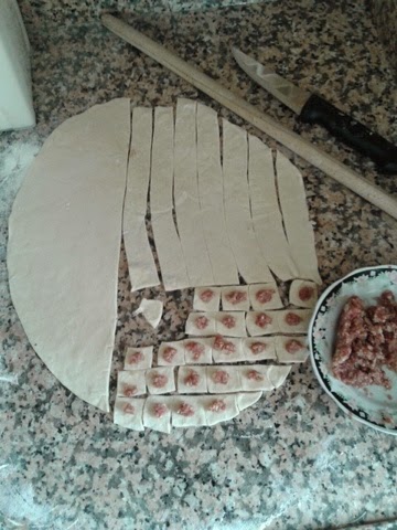 Açtığı mantı hamurunu küçük küçük kesip bildiğimiz mantı gibi bükmüş.