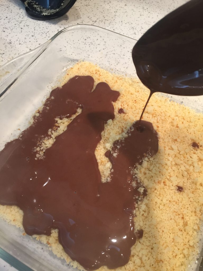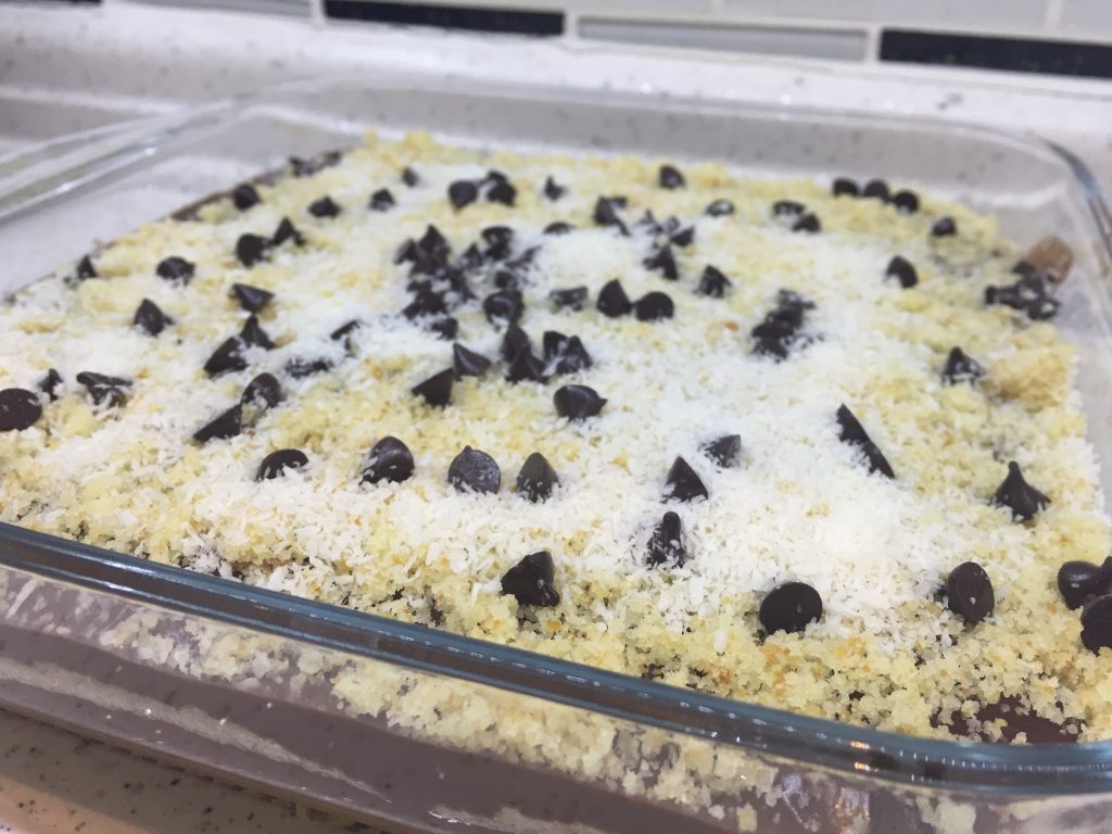 Borcamın altına kek parçalarını serdim. Üzerine pişirdiğim puddingten bir sıra döktüm. Ardından bir sıra daha kek parçalarından. Son olarak üzerini pudingle kapladım ve artan kırıntıları, parça çikolata ve hindistan cevizi ile süsledim.