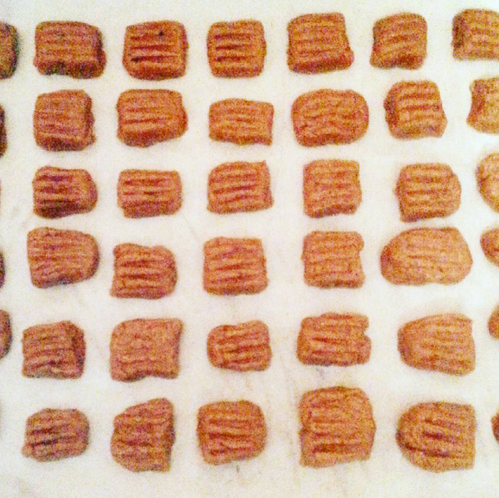 Biraz yoğurduktan sonra irmikli muzu da katın ve kulak memesi kıvamına gelinceye kadar yoğurun. Hamur istediğiniz kıvama geldiğinde ince uzun şeritler yapın ve 3-4 cm kalınlığında keserek üzerine çatalla bastırın. 180 derecede 15 dakika pişirin.