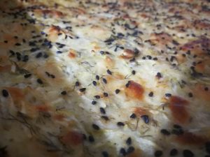 Üzerine çörek otu serpip 180 derecedeki fırında kızarana kadar pişirdik ve dilimleyerek servis yaptık.