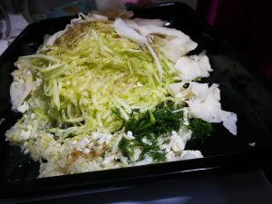 Daha sonraki denemelerde içerisine yeşil soğan ve un da ekledik. Mücverimsi bir kıvamı oluyor. Hatta yufka yerine tamamen un ekleyerek yapabilirsiniz. Eğer alerjiniz yoksa yumurta da güzel olabilir ama biz ikisinde de kullanmadık ama eminim güzel olur.
