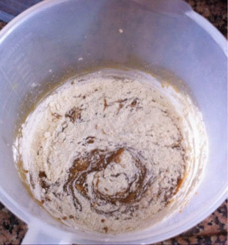 Esmer şeker ile tereyağını krema haline gelinceye kadar mikser ile iyice çırpın ve yumurtayı ekleyin. Daha sonra tarçını , zencefili, zerdeçalı, pekmezi ve vanilyayı ekleyerek çırpmaya devam edin.