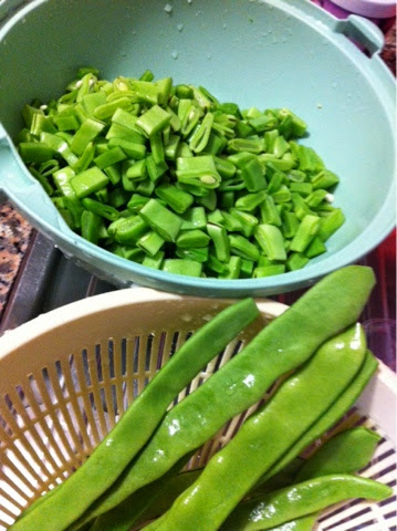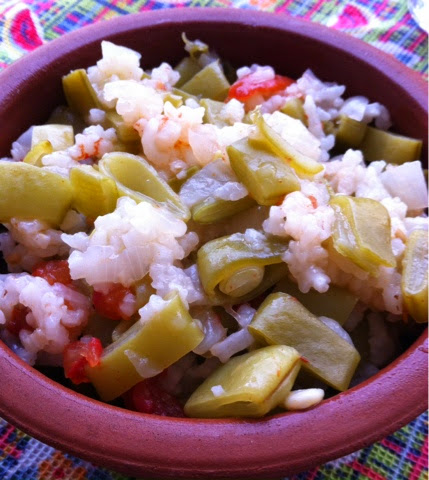 Fasulyeleri ayıkladıktan sonra 1 cm büyüklüğünde doğrayın. Doğradığımız fasulyeleri yıkıyoruz ve tencereye alın. Fasulyeye suyunu ekleyin. Üzerine sırasıyla yemeklik doğradığınız soğanı ve küp küp doğradığınız domatesi ekleyin. Son olarak pirinci yıkayın ve tencereye ekleyin. Tuzuda ekledikten sonra kaşığı dibine deydirmeden karıştırın.