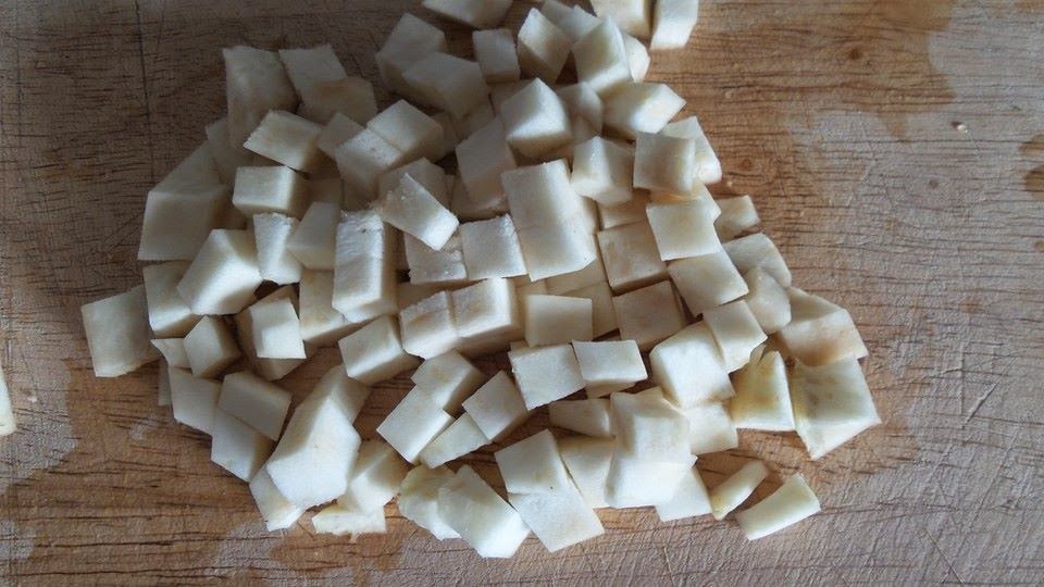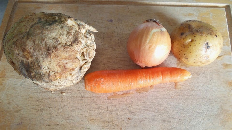 Önce soğanı rendeliyoruz. Kereviz, havuç ve patatesi küp küp doğruyoruz.