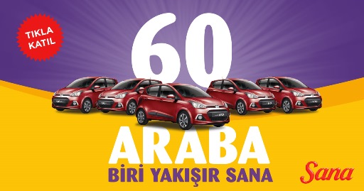 63. yılında sevenlerinin otomobil hayallerini gerçeğe kavuşturan Sana “60 Hyundai i10’dan #BiriYakışırSANA“ diyerek Sana alan herkese Hyundai i10 kazanma şansı sunuyor. Sana paket ve kaselerindeki şifreyi ad, soyad ve adresleriyle birlikte 6635’e gönderen veya www.sanabirtarifimvar.com adresinden paylaşan herkes bu çekilişe katılıyor… Son katılım tarihi ise 23 Nisan! Önemli bir bilgi daha: Çekilişe katıldığınız kodların bulunduğu Sana ambalajlarını ve alışveriş fişlerinizi saklamayı da unutmayın.
