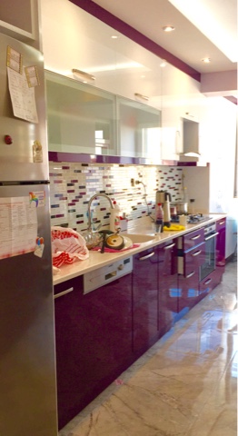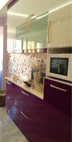 Badana gözüken yerlerde çok açık bir mor, yarım tezgah kısmında gömme alana mor tonlarıyla yaprak desenli bir duvar kağıdı yaptırdım ki hareket katsın..