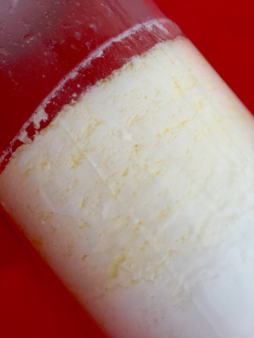 Aynı şekilde sağma inek sütlerinden aldığım kaymakları da dondurucuda sakladım ve 500ml kavanozun yarısı dolduğunda tereyağı hazırlamak için hazırlıklara başladım. İnek sütünün kaymakları oldukça yağlıydı. Keçi sütü o kadar olmasa da yoğurt mayalamaya yetecek kadar tereyağı bıraktı.