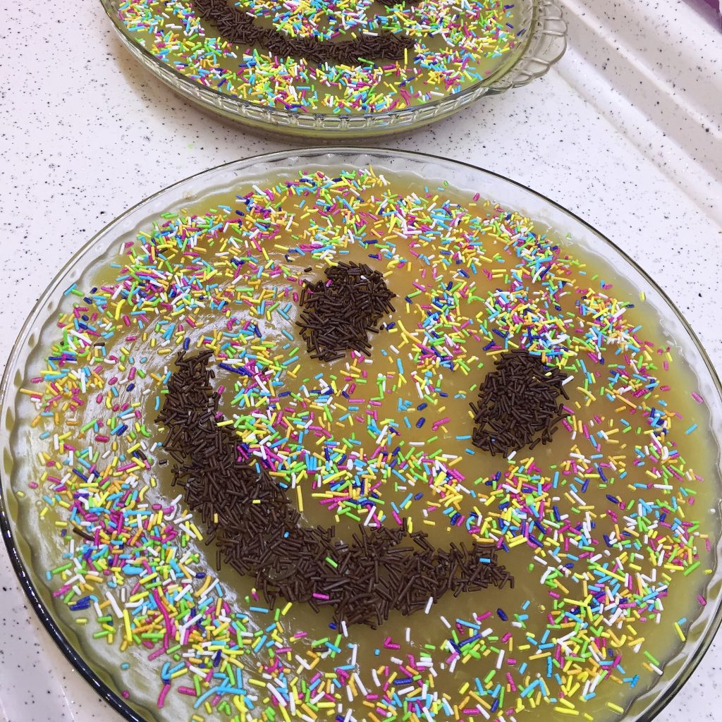 Jölesi için portakal suyu, nişasta, şeker ve suyu karıştırın. Ocağa alın ve sürekli karıştırarak muhallebi kıvamına gelince altını kapatın ve vanilyayı ekleyin. Kek soğuduktan sonra üzerine ılık jöleyi dökün ve jöle de soğuduktan sonra pasta süsleri ile süsleyin.