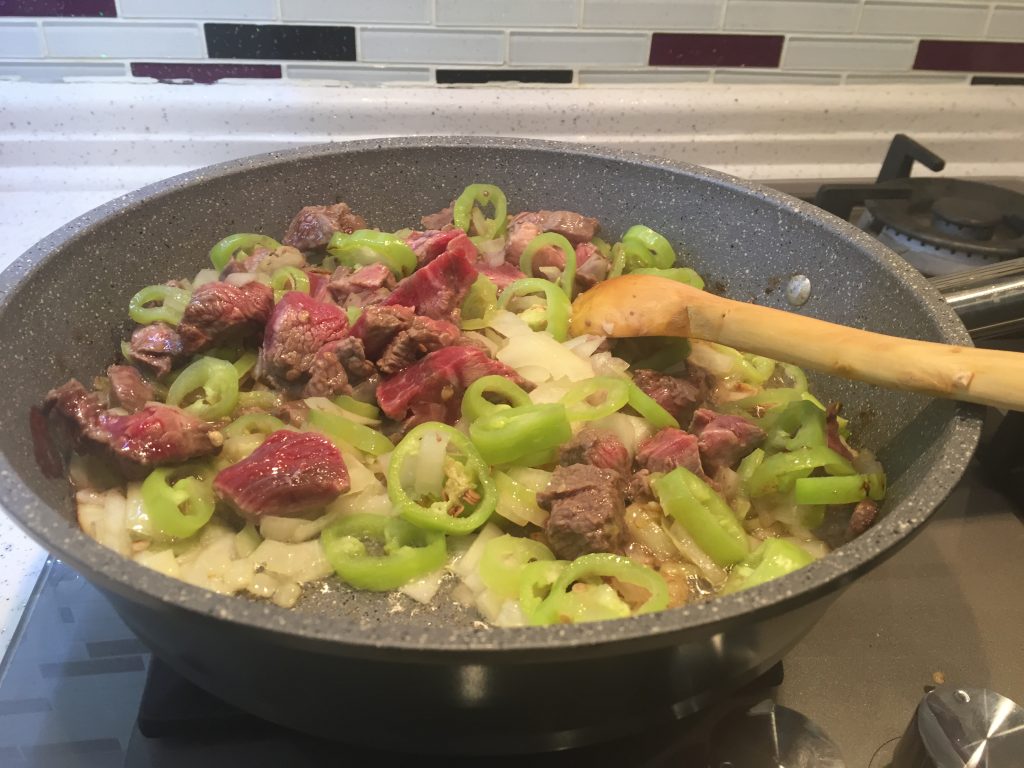 Ben her yemeği uzun süre kısık ateşte pişirmeyi tercih ettiğimden öncesinde eti kavurmuyorum. Soğan, sarımsak, biber ve etleri hep beraber atıyorum. Zeytinyağında kısık ateşte uzun süre kavuruyorum. Soğan ve biberler ölünce iri iri doğradığım mantarları atıyorum ve domatesleri atıyorum.