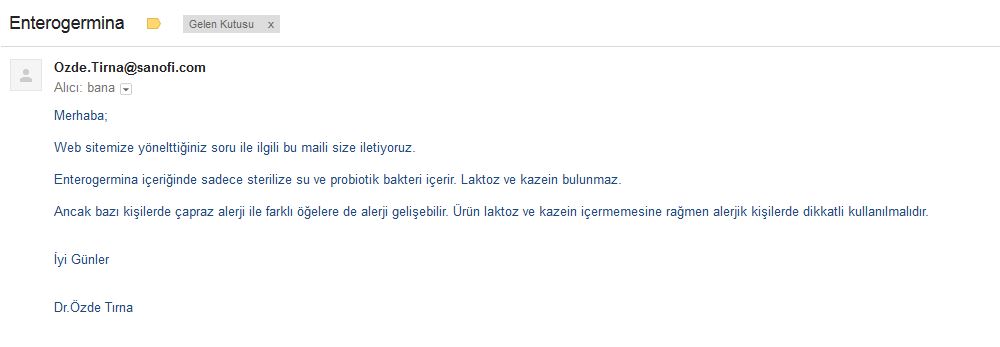 Ben de bu nedenle firmaya bir mail attım ve kısa süre içerisinde dönüş aldım. Firma içerisinde laktoz ve kazein olmamasına rağmen tedbirli davranıyor ve dikkatli kullanılmasını öneriyor. Mailde tam olarak şöyle yazıyor.