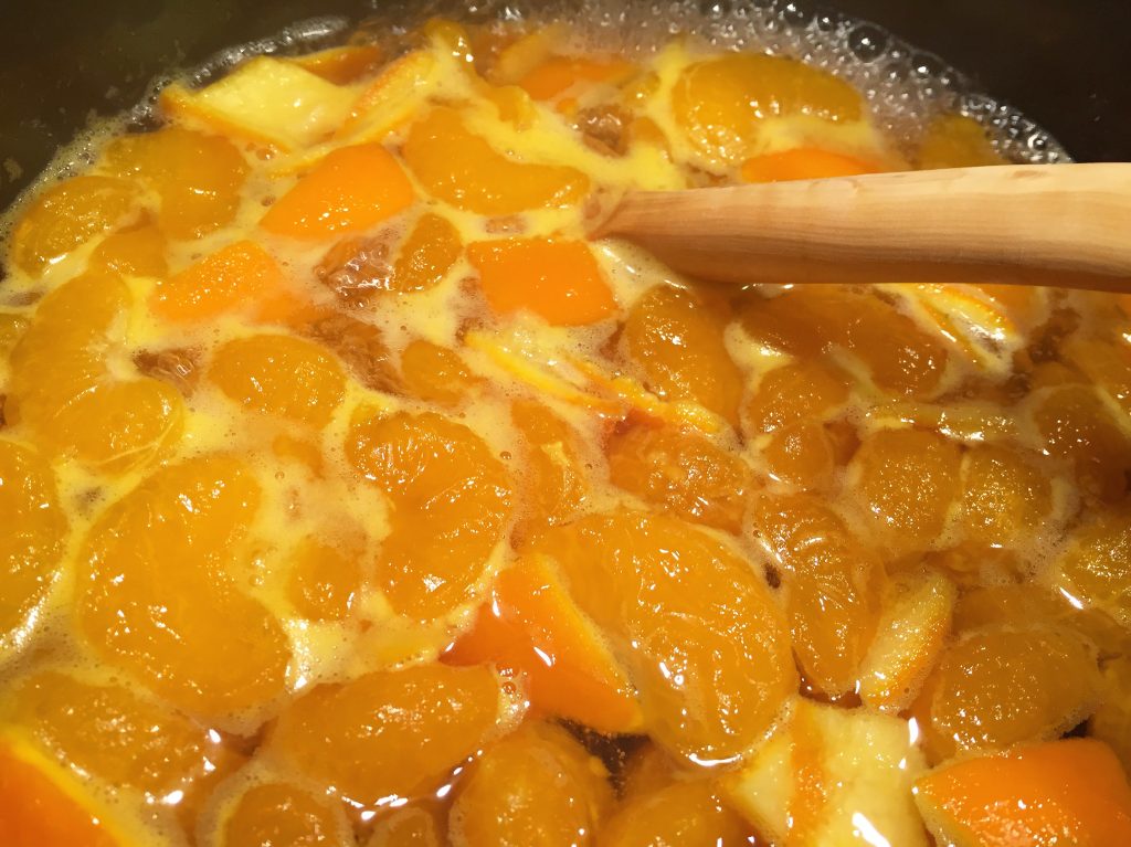 Bu arada su ve toz şekeri kaynatmaya başlayın. Şerbet koyulaşmaya başlayınca mandalina dilimleri ve portakal kabuğunu ekleyin. Arada karıştırarak pişirin. Bu sürede reçel iyice kıvamlanacak. Ocaktan almadan 10 dakika önce limon suyunu ekleyerek kaynatın. Bu sırada kullanacaksanız tarçını da ekleyin.