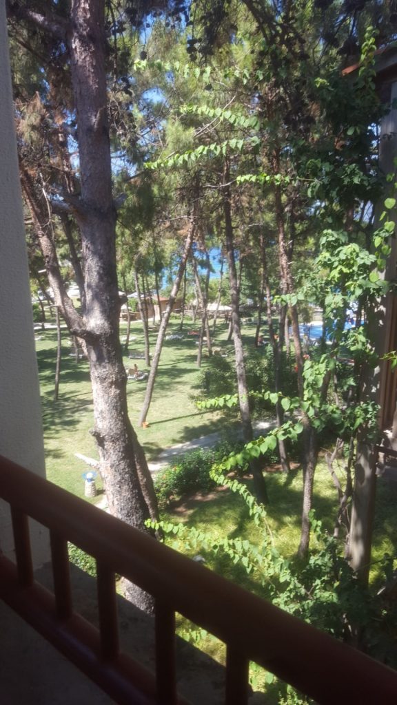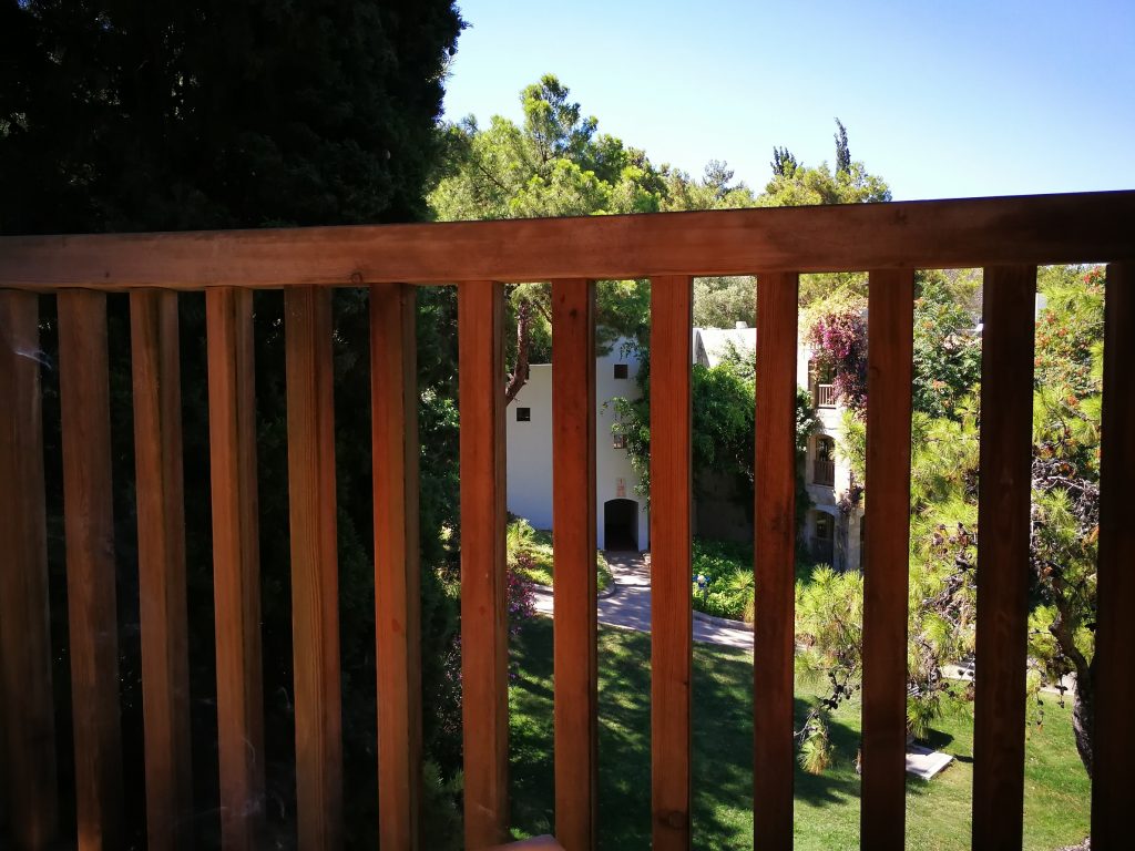 Odalar sahil ya da bahçeye bakıyor ve hepsinde balkon var. Bizim oda bahçe tarafındaydı ama ucundan kıyısından deniz manzaramız vardı. Balkonların şekli ve büyüklüğü odalara göre değişiyor. Bizim balkon küçük ama bize yetecek kadar büyük bir balkondu. Her balkona sehpa ve iki koltuk koymuşlar… Her akşam çay, kahve keyfimizi burada yaptık.
