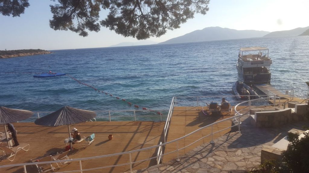 Oteli İsviçreli lüks devremülk şirketi Hapimag işletiyor ve 200 dönümlük bir alana kurulu. Devremülklerde de daimi kalan 22 aile varmış. Yani işletme yaz kış açık. Otelin 3 tane koyu var ve gitmeden önceki araştırmalarımızdan da öğrendiğimiz gibi Bodrum’un en güzel denizine sahip. Oldukça büyük bir alanda çam ormanın içerisinde kurulu bir cennet burası. Denizi mavi bayraklı ve dalış okulu var. Dışarıya göre biraz pahalı ama burada dalmak için değer. Discovery dalış kıyıdan yapılıyor ve ekipman dahil fiyatı 100 tl, tekne dalışı ise yine ekipman ve yemek dahil 200tl. Tekne turu sabah 09.00’da başlıyor, öğleden sonra 13.00 gibi bitiyor ve 2 dalış yapıyorsunuz. Biz bir yıldır dalış yapmadığımız için Discovery tercih ettik. Deniz akvaryum gibi ve ahtapot caretta gibi canlıları görme şansınız var. Tekne dalışında çevrede olan 3 batığa gidip daha keyifli bir deneyim yaşamak mümkün ama biz Asya’nın havuz sevdası yüzünden fırsat bulamadık maalesef.