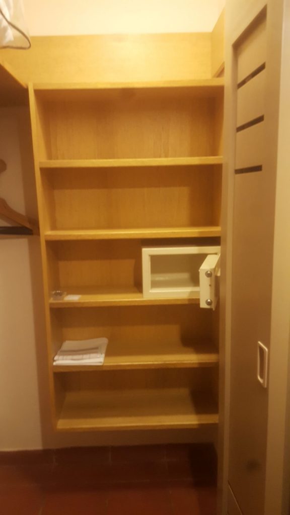 Odalara ilk girdiğinizde tuvalet ve banyo var. Banyo ferah ve kullanışlı. Banyo içerisinden tuvalete giriyorsunuz. Banyoya açılan kapının arkası tuvalet. Tuvaleti kullanacağınız zaman kapının aksi tarafı tuvaleti kapatıyor. Yeri kullanışlı hale getirmek için güzel bir çözüm olmuş. Hemen karşısında giyinme odası mevcut. Ufak ama tüm eşyalarını asabileceğiniz askılık, raflar ve mini bir kasa var bu odada. Tüm bavullarımızı da bu alana yerleştirebilirsiniz.