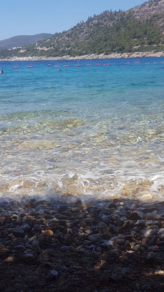 Biz gündüzleri kahvaltıdan sonra hemen sahile gittik. Sahildeki iskelenin sol tarafın denizi de kusmsalı da taşlık, sağ tarafı kumluk alan.