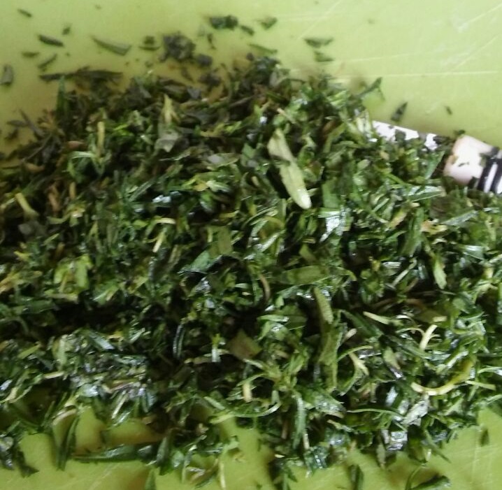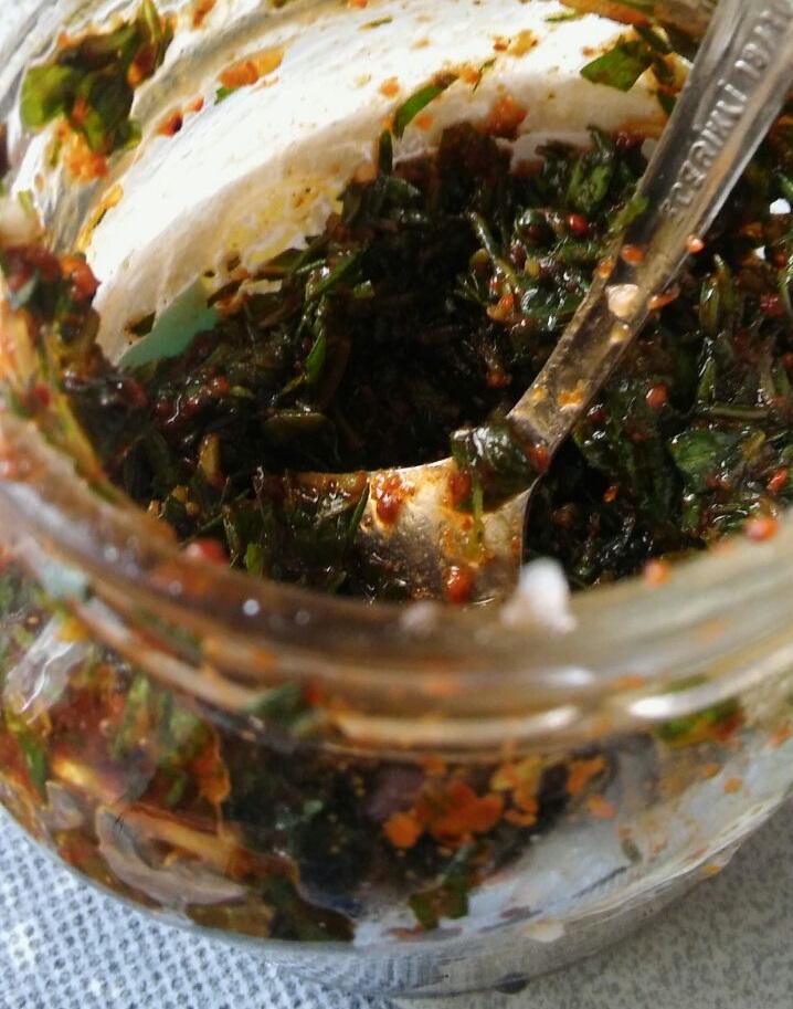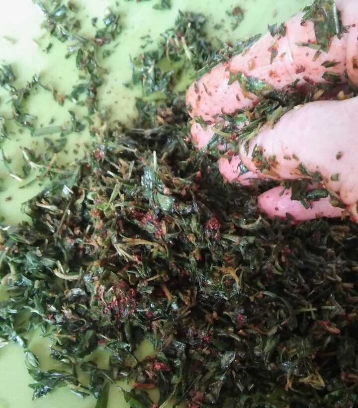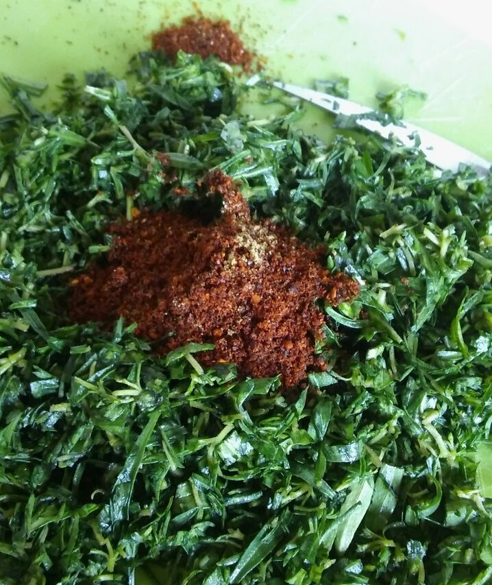Kekiği ayiklayın ve bir kaç su güzelce yıkayın. Tuz ile iyice ölene kadar yoğurun. Pul biberi de ekleyin ve bir süre daha yoğurun. sonra geri kalan malzemeleri karıştırın.