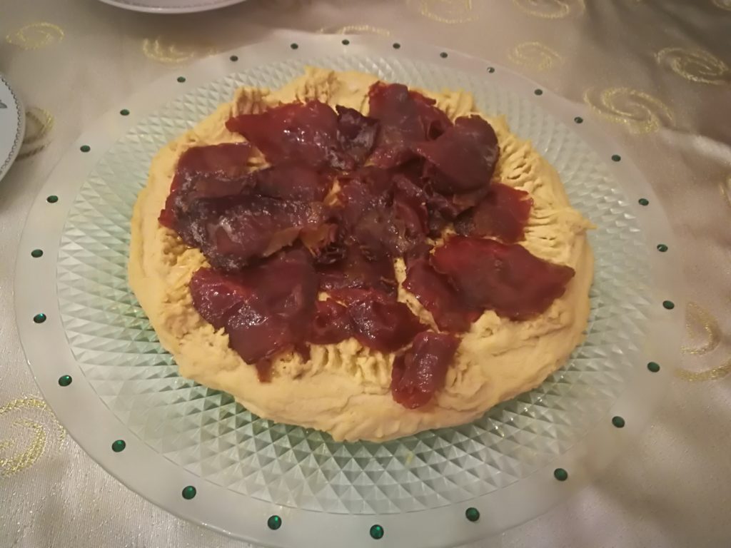 Sos tenceresinde teretyağı ve zeytin yağını kızdırıp tatlı toz kırmızı biberi yakın. Kızan yağın üzerine pastırmaları ekleyin ve karışımla humusu süsleyin.