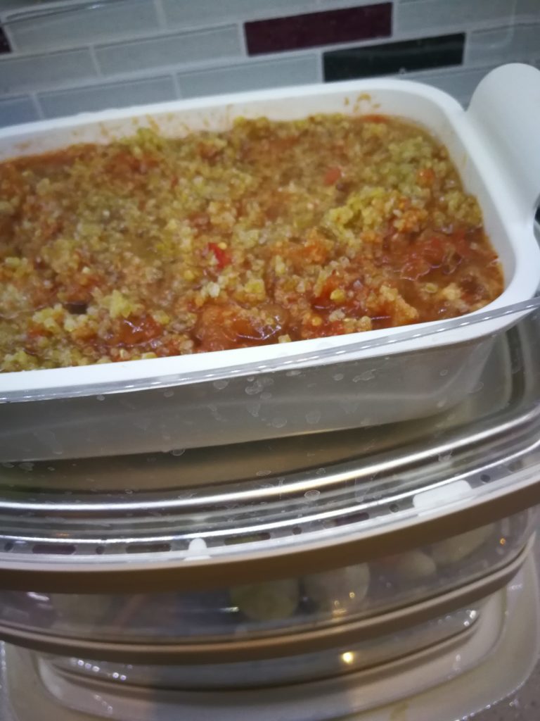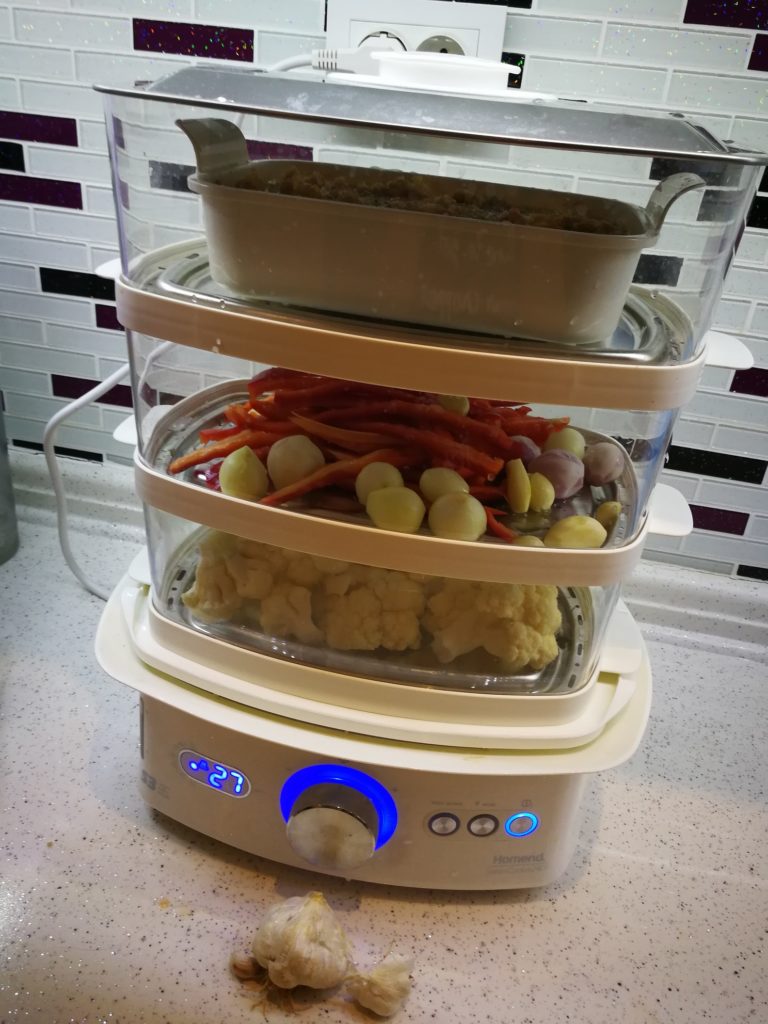 3 katlı olan buharlı pişiricimin küçük bir kabı var pilavı bunun içinde pişiriyorum. Diğer katlara pişme sürelerine göre sebzeleri koyuyorum ve en üst katta pilav demleniyor.